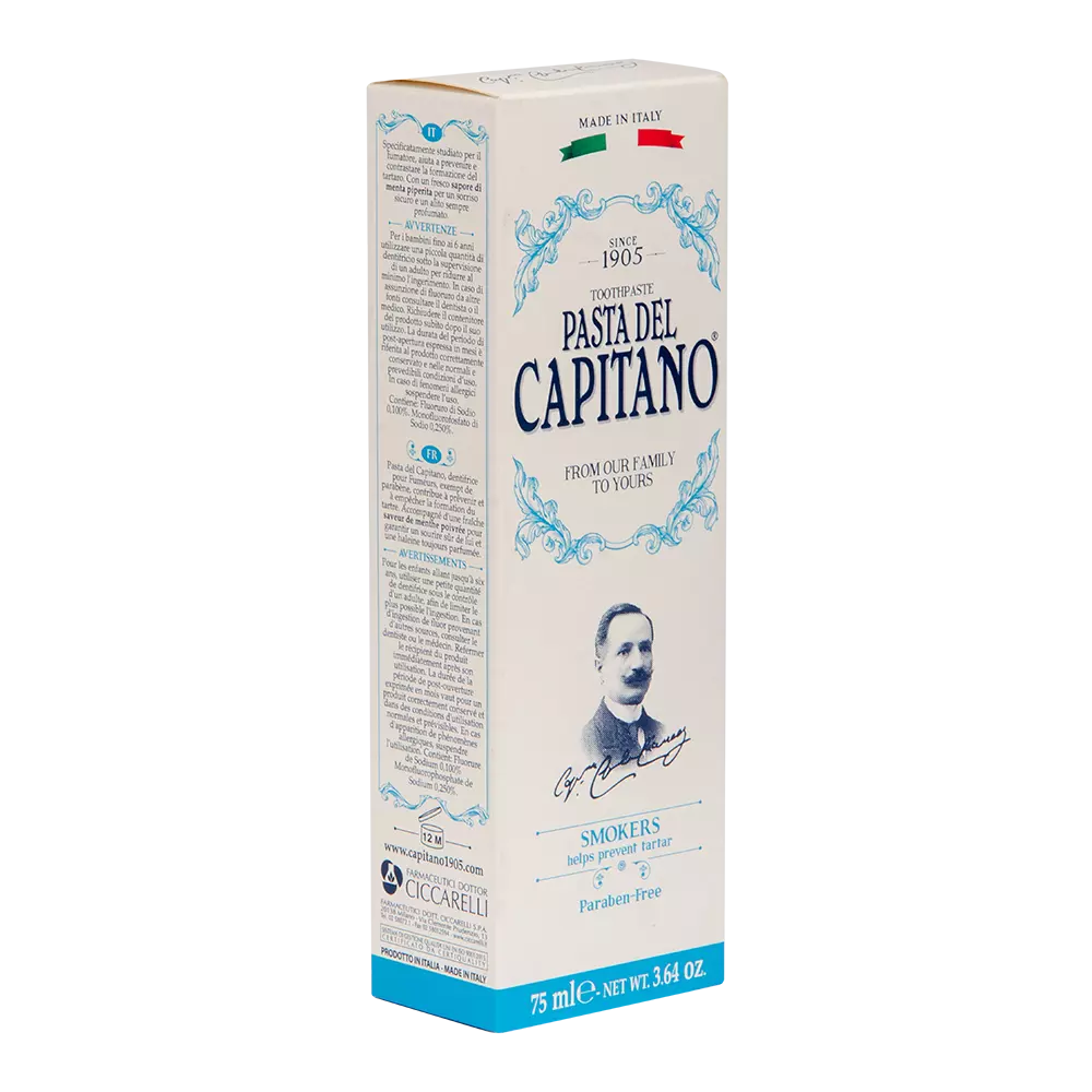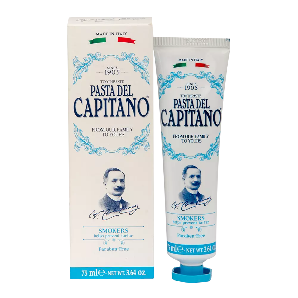 Збалансована, продумана формула пасти має склад з великою кількістю антисептичних компонентів, які ліквідують бактерії, що провокують утворення карієсу і дерматологічних інфекцій слизової. При цьому паста делікатно відбілює зуби, зміцнюючи емаль, а натуральний екстракт м'яти чудово освіжає подих. Pasta Del Capitano Smokers Toothpaste - справжня знахідка для курців які хочуть зберегти білизну і здоров'я своєї посмішки.