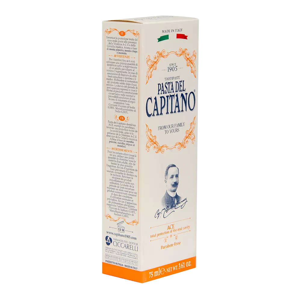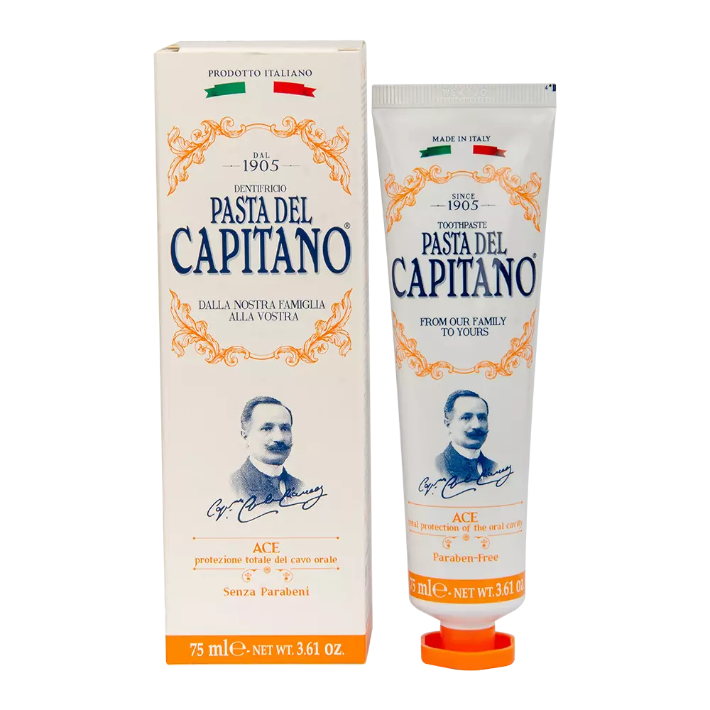Pasta Del Capitano Ace - це унікальна зубна паста з вітамінами ACE, що допомагає підтримувати захист слизової оболонки, сприяє виробленню необхідної кількості колагену і запобігає розхитуванню і випаданню зубів. Ефективно усуває зубний наліт і запобігає утворенню карієсу, а також дарує відчуття чистоти і свіжості, яке буде з вами протягом усього дня.