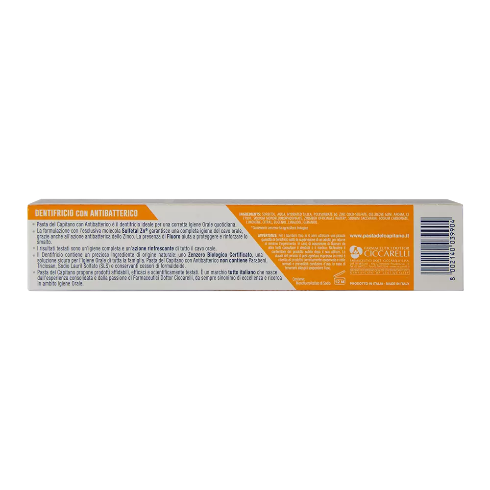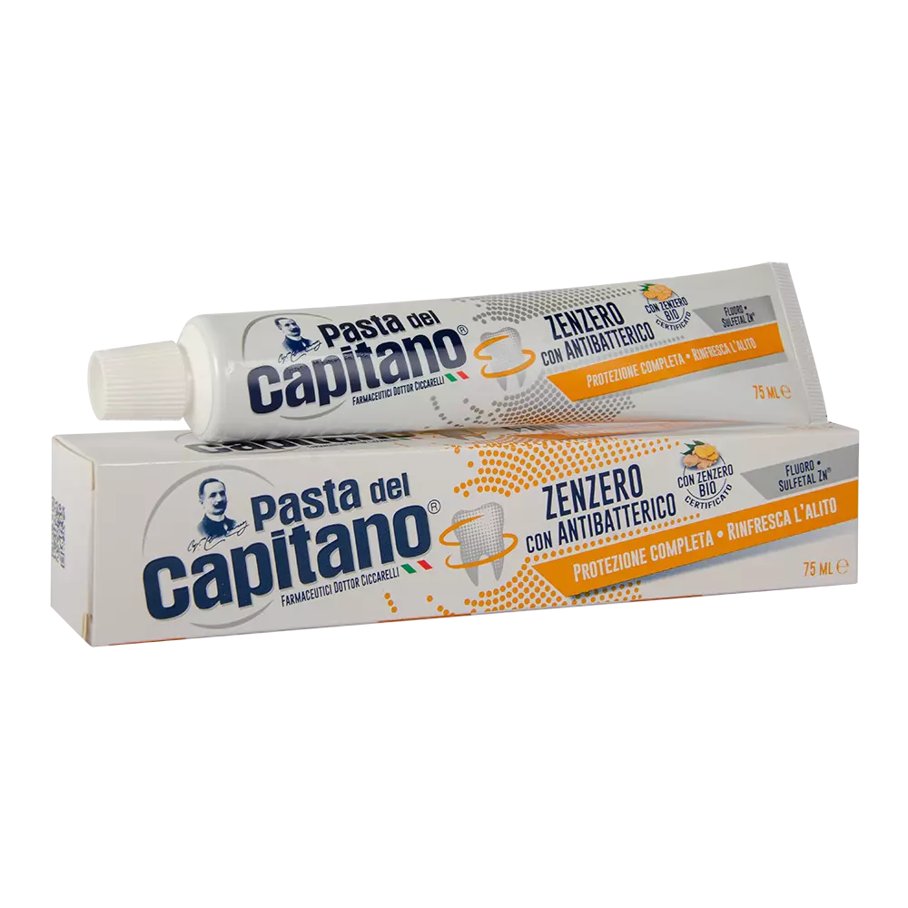 Зубна паста Pasta del Capitano Zenzero містить цінний інгредієнт - органічний, сертифікований імбир. Це безпечне рішення антибактеріального догляду за зубами, глибокого їх очищення і свіжого дихання для всієї родини. Паста Pasta del Capitano з імбиром, як і всі інші пасти бренду не містить парабенів, триклозану, лаурилсульфату натрію (SLS) і консервантів формальдегіду.