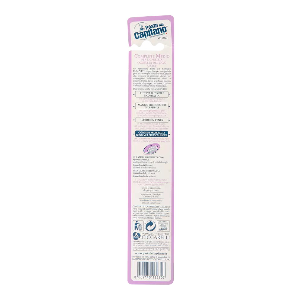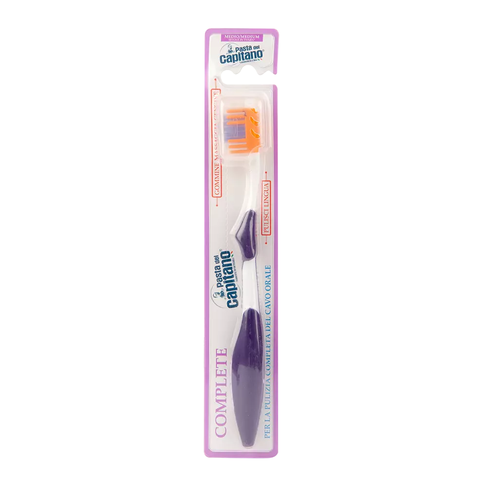 Зубна щітка Pasta Del Capitano Complete Professional гарантує глибоке очищення порожнини рота і міжзубного простору завдяки щетині Tynex. Головка щітки обладнана очищувачем язика, допомагає зняти бактеріальний шар, який є основною причиною неприємного запаху з рота. Бічні елементи ніжно масажують ясна.